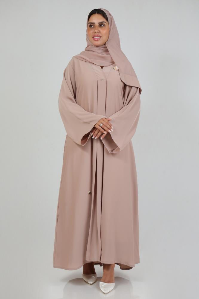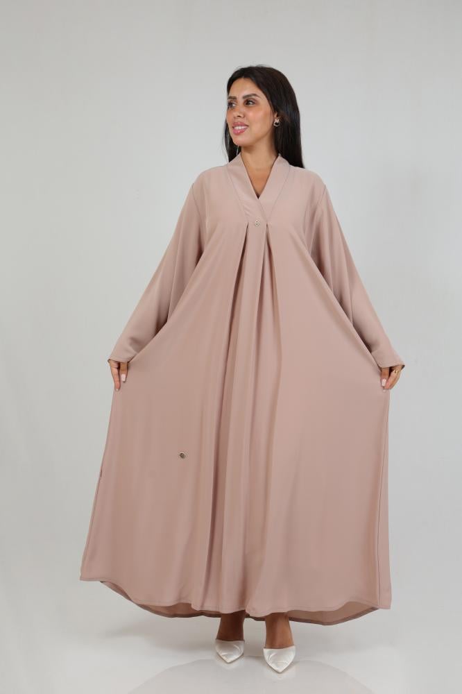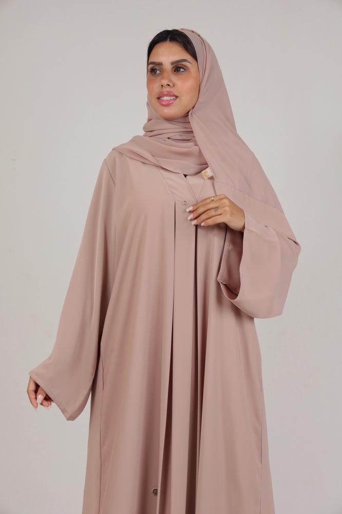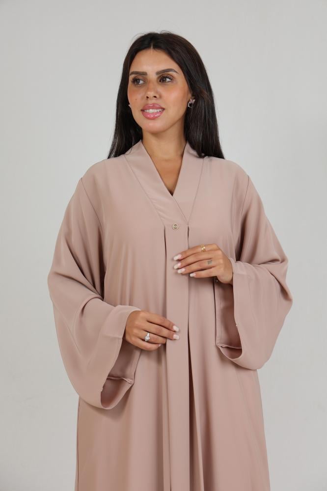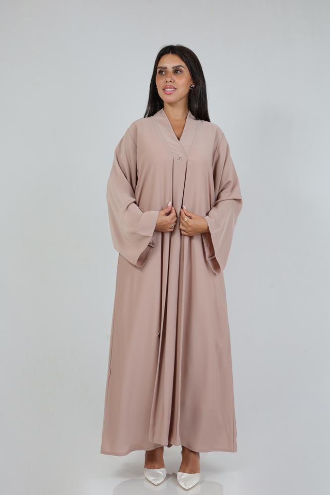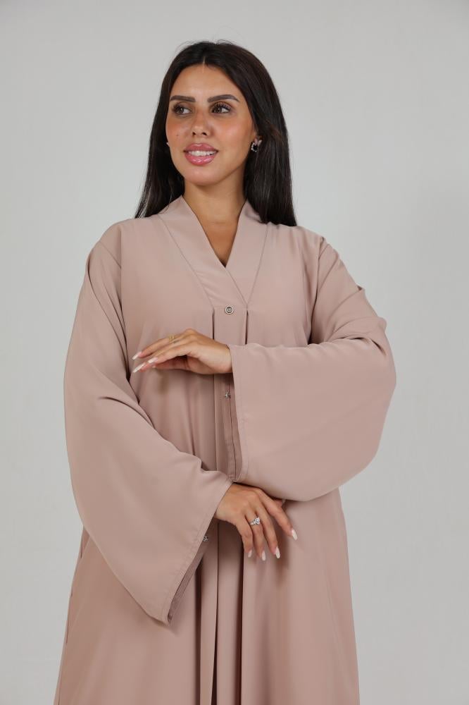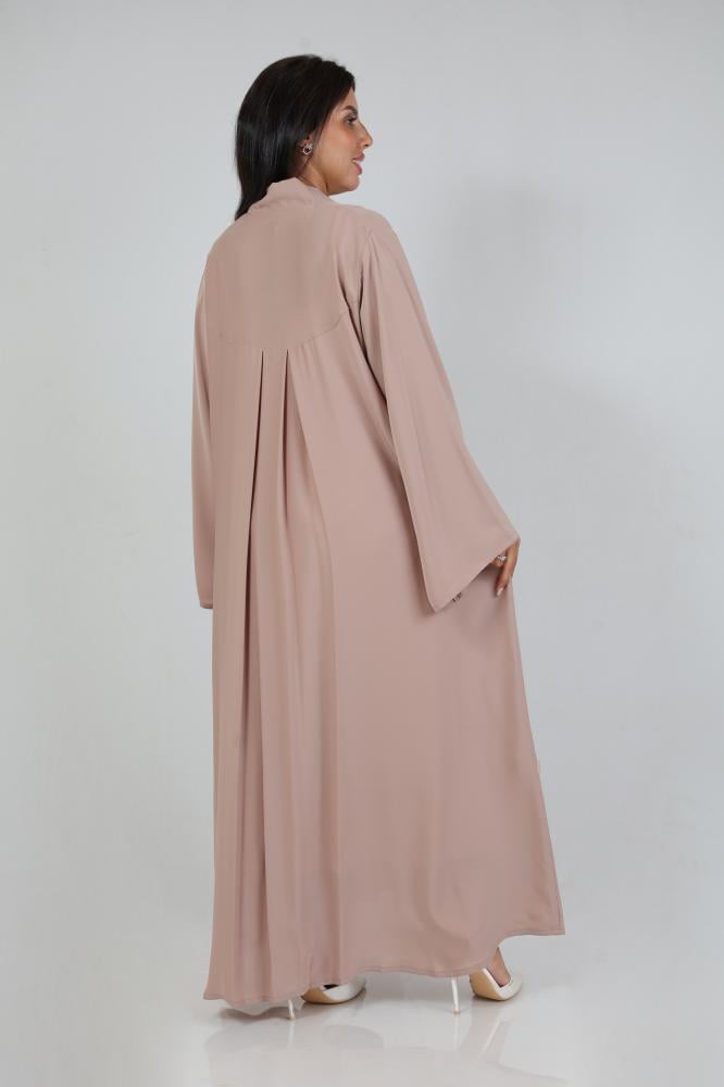It is an elegant abaya blending simplicity and sophistication with a refined, understated charm. The soft light pink hue lends a polished yet professional look, perfect for special occasions or elevated everyday wear.